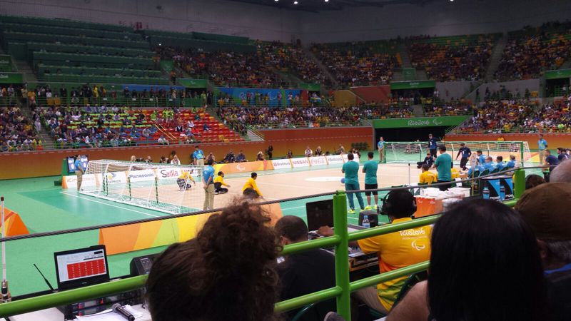 Auch beim weniger bekannten Goalball konnten wir uns ein Spiel ansehen. Hier werden den Spielern noch zusätzlich die Augen verbunden, damit wirklich nichts gesehen werden kann. Ziel ist es hier den Ball ins gegnerische Tor zu rollen. Der Ball ist mit etwas gefüllt das man ihn hört. Deswegen muss es in der Arena auch still sein.